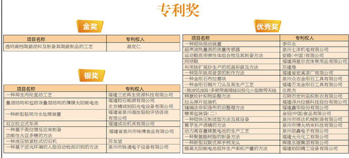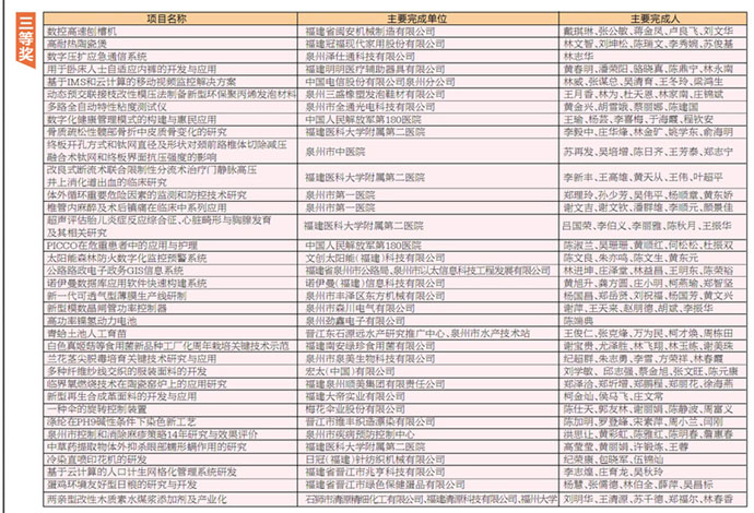 评选活动共收到符合申报要求的项目243个,经过项目申报、形式审查、公示及专家组评审等环节,及市科学技术奖评审委员会审核后,诞生评审结果:“福建百宏聚纤科技实业有限公司”获评泉州市科技重大贡献奖;“峰安皮业股份有限公司”等3家企业获评市政府企业创新奖;“福建纳川管材科技股份有限公司”等3家企业获评泉州市科技创业奖。此外,因今年申报泉州科技进步奖项目数量多、质量较高,科技进步奖和专利奖授奖数分别增至55项和27项。