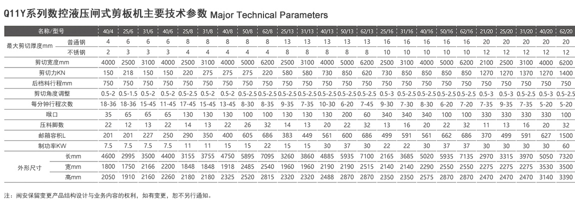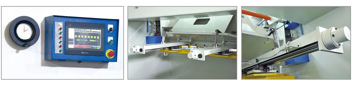 机架采用整体焊接结构,经振动去除应力。 采用三点式支承滚动导航,提高剪切质量。 矩形刀片,四刃均可使用,使用寿命长。 刀片间隙可迅速调整,并有数值显示。 配有灯光对线装置。 剪切角可调整。 机动后挡料有数字显示,准确可靠。 采用栏式安全保护装置